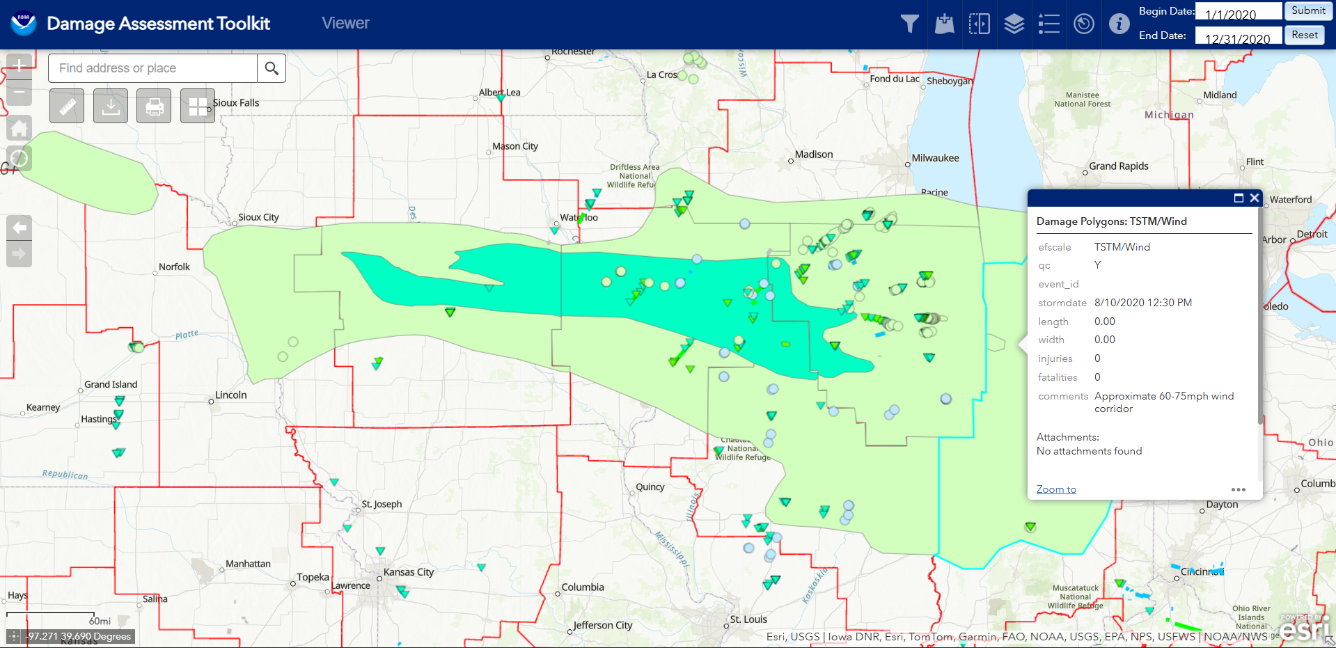 This classification is a generalization for straight line wind damage. It is used for straight line wind damage, as shown in the image beside, which is from the 2020 derecho in Iowa. On occasion, NWS offices also use this Classification to show non-tornadic damage in a storms path, such as RFD damage, or FFD damage. As stated earlier, this damage is non-tornadic, and is usually realtively weak, somewhere below the EF0 Threshold, or around EF0 windspeeds.