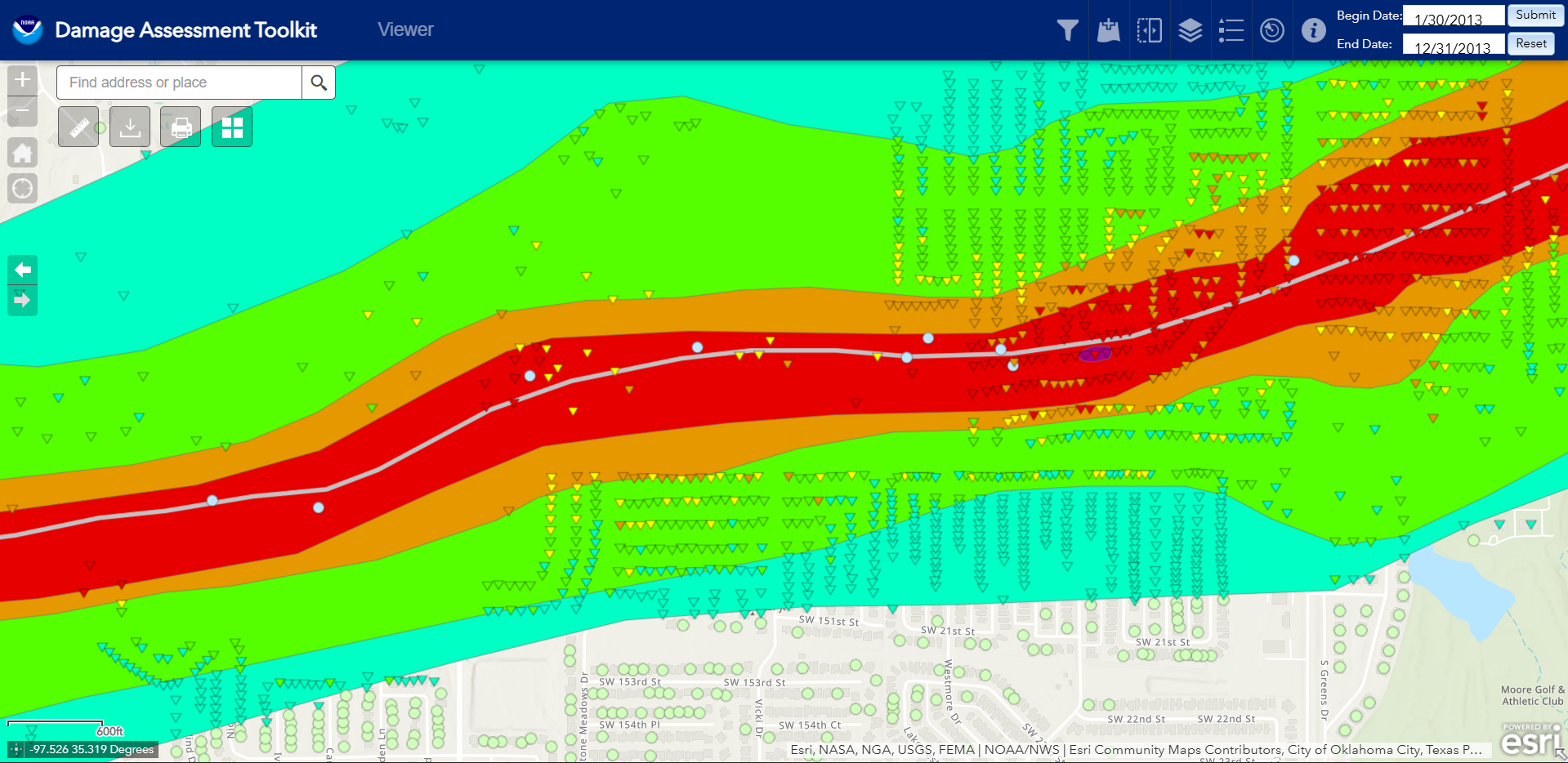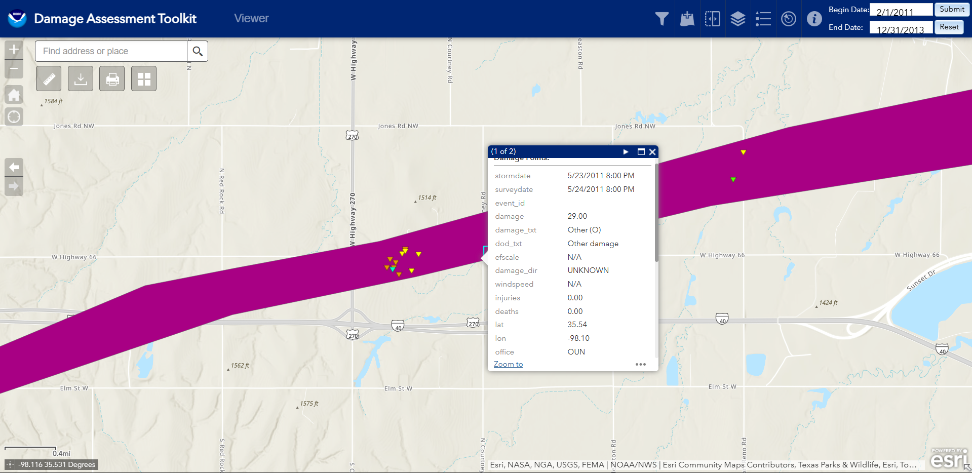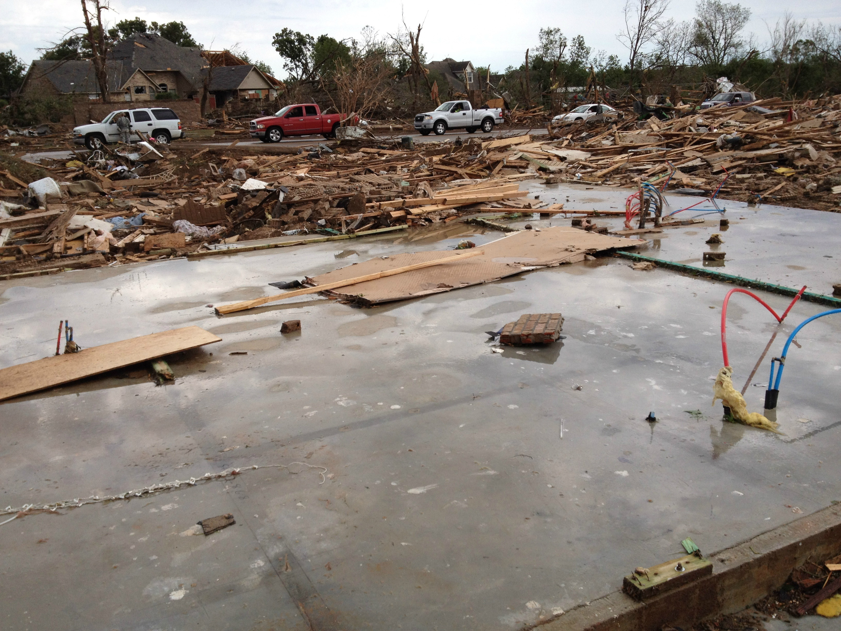 Another great example of this is the May 20th, 2013 Moore EF5, where it threw several oil tanks (originating from the Other DI on the left-most side on the image to the left) and tossed them quite a distance. In addition to these tanks, the one in the middle, by itself, is actually for severe ground-scouring. One of the cool things is that you can actually see these tanks on satellite data from right after the tornado, on google earth (if you want to download a KMZ file from my Google Earth Project here)!