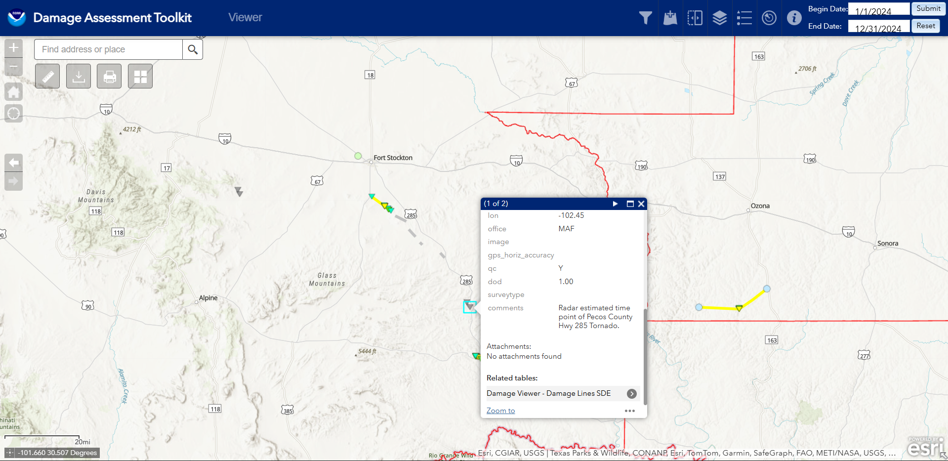 The EF-Unknown, or EFU for short, is typcally used when there is no damage-based evidence that a tornado happened, but there was video/photo evidence or lately, chaser livestreams, or if an NWS employee/trained spotter confirms a tornado. In addition, NWS Offices may also use this classification if they are unable to reach the damage and properly assess it. In recent years, especially in South-eastern Texas, the NWS offices have been using Chasers who livestream to confirm tornadoes that either don't have any damage, or are in places where its impossible to get to, or if they are legally not allowed to reach. One of the more recent examples of this is the Fort Stockton outbreak back in 2024 (pictured on the left), where the majority of tornadoes happened over cattle ranches, or just land where they couldnt access, but used Chaser feeds/photos/videos along with Radar data to plot and track these EFU paths. On the DAT, for the most part, these polygons, lines and DI's usually dont have any photos associated with them, hence the lack of a photo examples section.