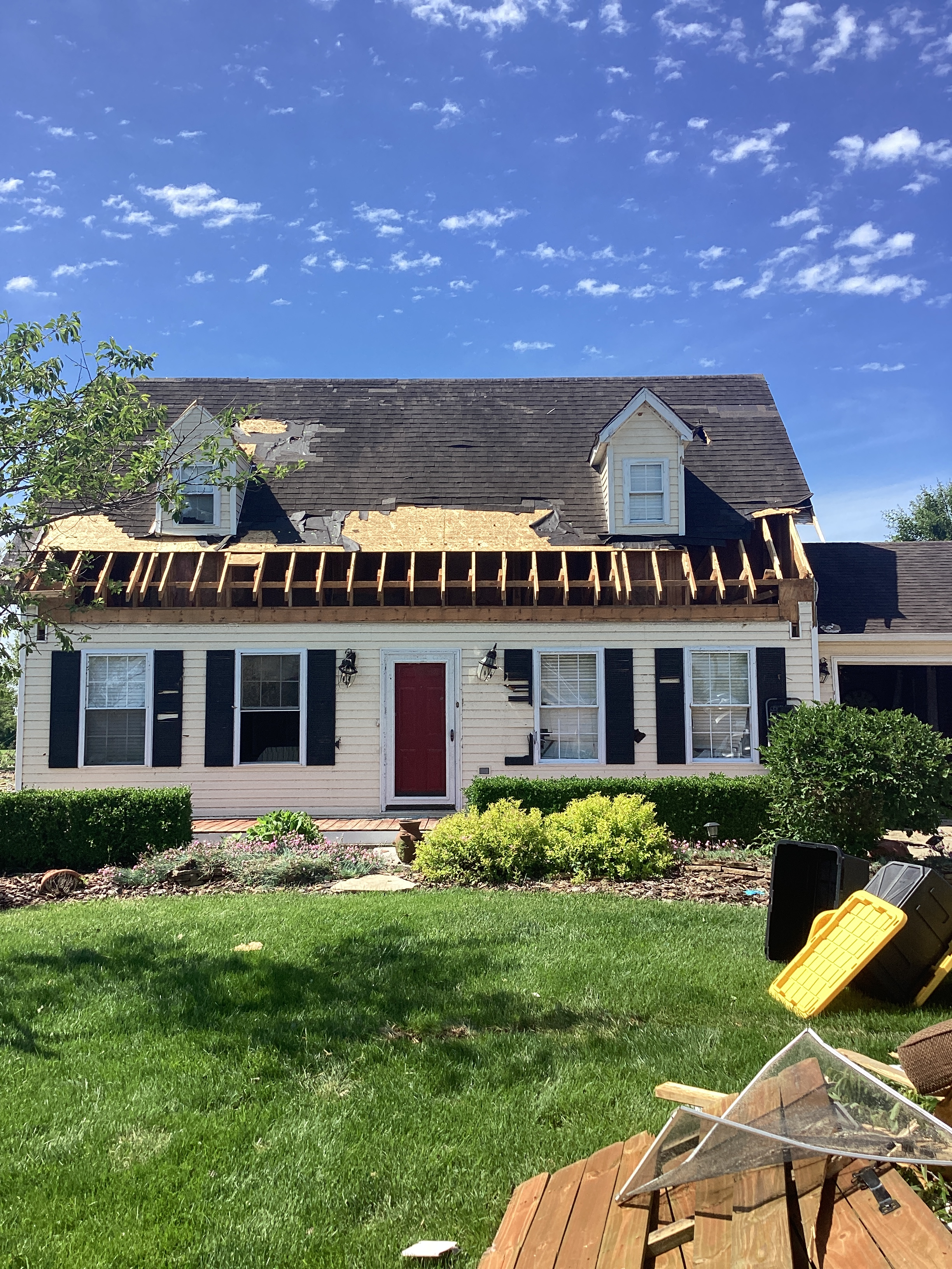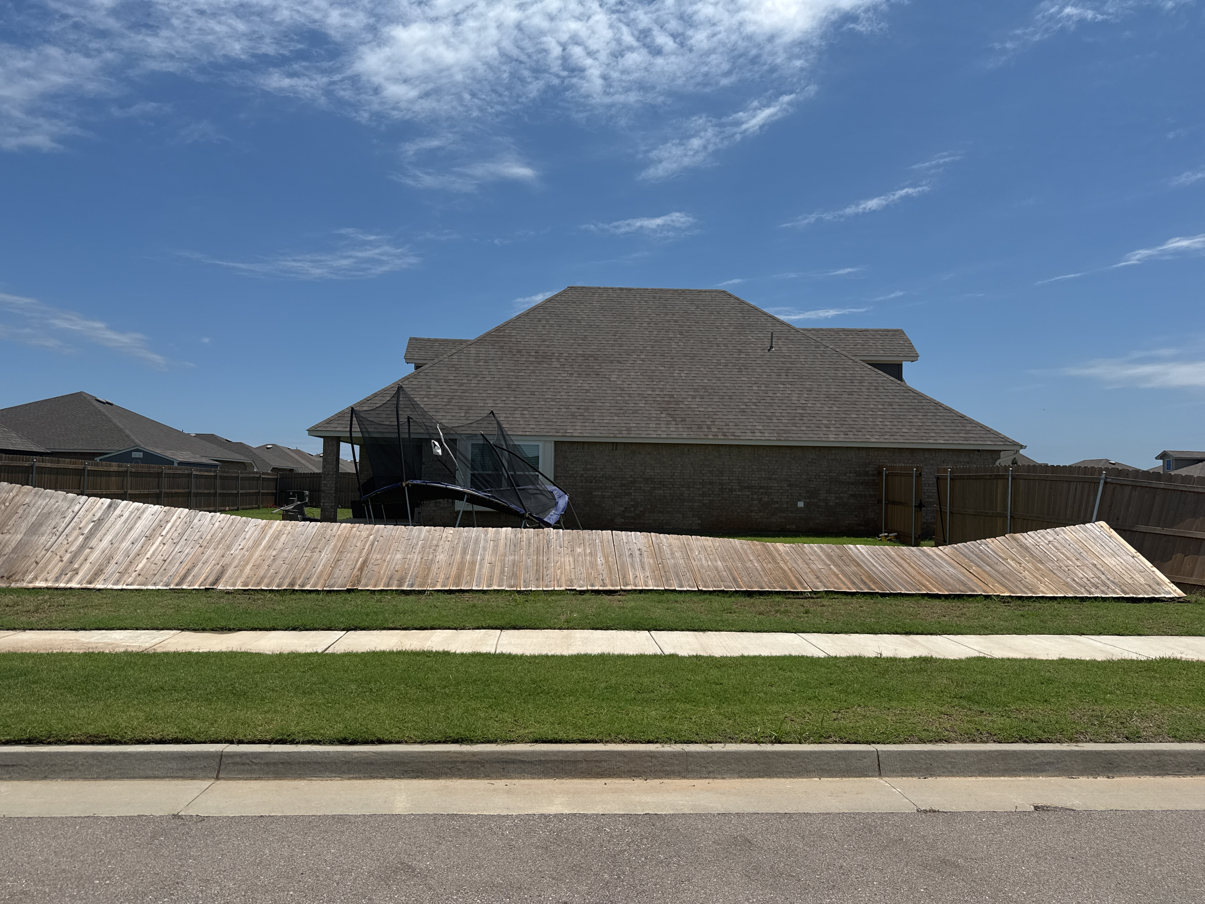 EF0 damage is where the "proper" rating starts, with specific Degree's of Damage (DOD), which are descriptions of damage to specific buildings, are now being used. EF0 damage is associated with estimated winds between 65mph to 85mph, otherwise known as relatively weak winds. In the scale itself, damage is described as being minor damage, with well-built (strong) houses typically unscathed, sometimes with shattered windows, and in other houses, minor damage to roofs and chimneys. Large signs and bilboards. Trees can have branches broken and shallow-rooted trees can be up-rooted. As seen on the image on the left, fences can be pushed over, and trampolines, and other small objects, can be thrown some distance away. Now you might think that this damage would be pretty hard to differentiate between regular thunderstorm wind damage right? Actually its really easy to tell, by using the way the debris falls. If the debris falls all pointing in the same direction, thats probably due to linear winds, but if they fall in like a spring or a slinky kind of way (spiriling about a point on a line), then thats tornadic damage! Usually its hard to tell from just one photo, like the one on the left, but these surveyors are well-seasoned and have greater context clues, they know what they are looking for!