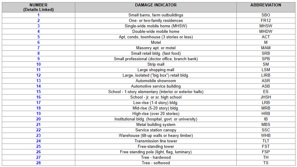 Above is a table of all the Damage Indicators, or DI's, table taken from weather.gov's site on the EF scale. In total, there are 28 Di's, ranging from family homes, to skyrises and even trees. Each one of these DI's has a Degree of Damage, or DOD, where by using a brief description of the damage observed, and by infering the construction quality (this is where the controversy starts, since it can differ so much between each person), they can use the estimated windspeeds to conclude the rating on the EF scale. Lets use an example.