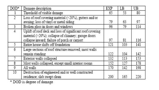 On the image to the left is the DOD table for the One and Two Family Residences (FR12) DI. Here we can see the DOD, or level of damage, based on consecutive integers (not all DI's have 10 DOD's), and then the brief description of the damage. But then what is the columns to the right? Thats the building's construction quality. EXP stands for the EXPected rating, or what the typical construction in the US should look like (this is different in other countries), the LB stands for Lower-Bound, or the construction quality is worse than whats typically seen, and then the UB stands for Upper-Bound, which is the construction quality better than whats typically seen. All DI's have this EXP, LB and UB quality system, which is confusing when we start talking about trees and poles. Lastly, we have the associated windspeeds for each DOD and building quality. In most cases, in the EF scale document, there is a graph that plots the DOD level and the estimated windspeeds, with separate graphs for EXP, LB and UB.