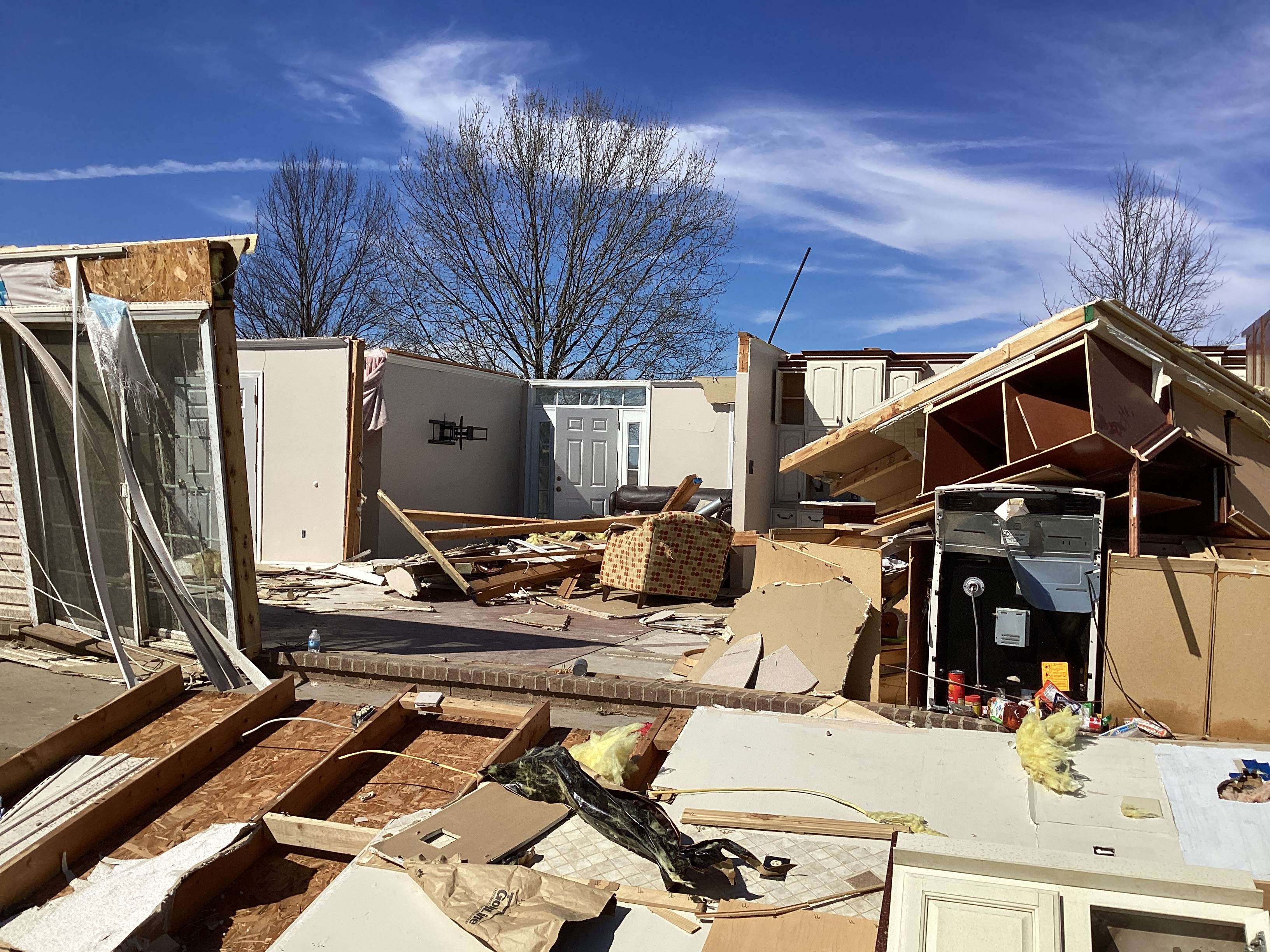EF3 level damage has winds estimated between 136mph and 165mph. In the scale, the damage is described as severe damage. A few parts of affected buildings are left standing, Well-built structures lose all outer and some inner walls, Unanchored homes are swept away, and homes with poor anchoring may collapse entirely, Trains and train cars are all overturned, Small vehicles and similarly sized objects are lifted off the ground and tossed as projectiles, Wooded areas suffer an almost total loss of vegetation and some tree debarking may occur. EF3's are where we start to see homes completely destroyed, and no more debris on the foundation, although this is only for homes where there is no, or poor, anchoring to the foundation. This has a nickname, a Slabbed Home, or a tornado "slabbed" houses. Essentially this is just saying that the tornado destroyed the house to the point where the only thing thats left is just the foundation. In my personal experience, EF3 can range from just a roof gone, to the entire house gone. And you can get some really weird DI's too, one of the craziest I can remember is from on in Oklahoma, where the two sides of the house have the walls standing, and the center of the house is gone, like a bulldozer went through the center. If I remember correctly, it was rated as a mid-range (~145mph to 150mph) EF3.
